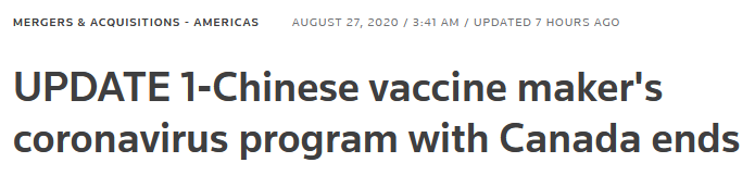 当地时间8月26日,路透社、加拿大《环球邮报》先后报道说,加拿大国家研究委员会(NRC)当天(26日)表示,已终止与中国企业康希诺生物在研发新冠病毒疫苗方面的合作,称后者目前无权运送疫苗。