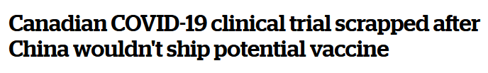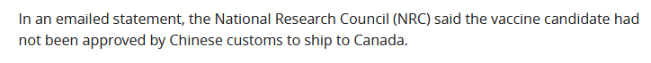 《环球邮报》称,加拿大国家研究委员会在一份电子邮件声明中表示,该候选疫苗未经中国海关批准运往加拿大。
