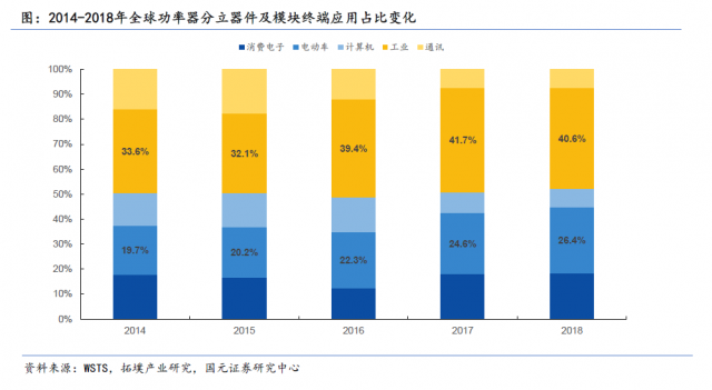 在市场占比方面,WSTS统计显示,2014—2018年功率半导体的主要应用领域是工业、车用和消费电子。占比最大的是工业领域,2018年占比超过40%;其次是电动汽车领域,2018年占比达26.4%。