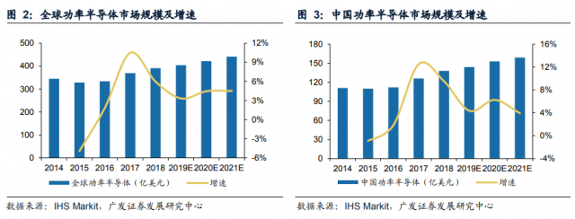 全球市场方面,功率半导体市场规模呈现稳健增长态势。根据IHS Markit数据,2018年全球功率半导体市场规模约为391亿美元,预计至2021年市场规模将增长至441亿美元,年化增速为4.1%。
