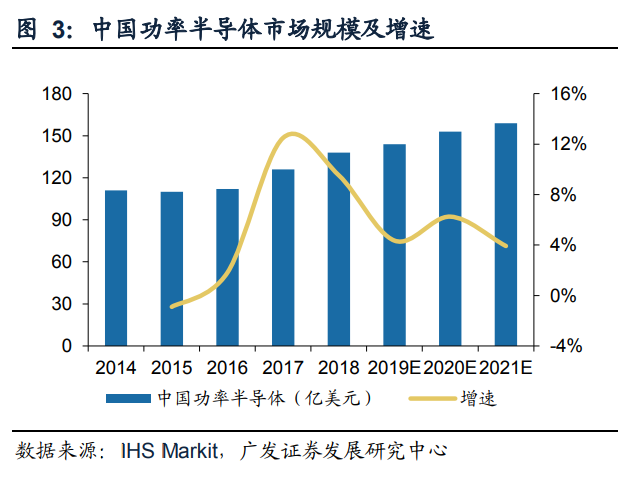 IHS Markit数据显示,2018年中国市场需求规模达到138亿美元,增速为9.5%,占全球需求比例高达35%。市场普遍预计未来中国功率半导体将继续保持较高速度增长,2021年市场规模有望达到159亿美元,年复合增速达4.8%。