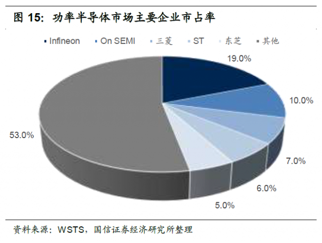 在头部企业方面,目前市场占比最大的企业是英飞凌,约占19%左右。公司最重要的产品是MOSFET和IGBT。