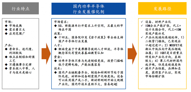 在市场需求、政策、人才、资金和技术多因素催化下,国内功率半导体行业未来3—5年有望进入黄金发展期。功率半导体在可预见将来有望成为国产替代进度最快的细分领域之一。