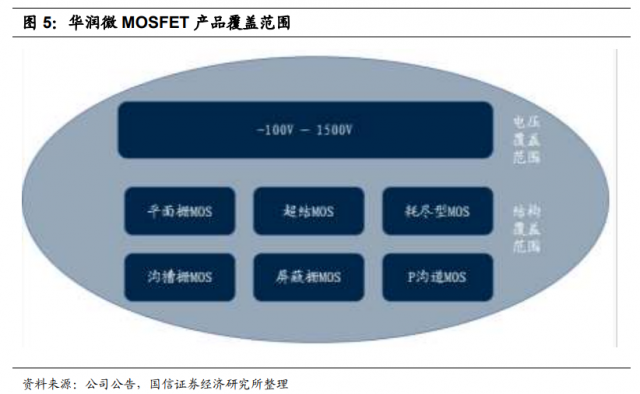 在产品线方面,华润微是国内产品线最为全面的功率分立器件厂商。MOSFET产品国内营收规模最大,技术能力领先。MOSFET产品国内市占率9%,仅次于英飞凌及安森美,中国企业中排名第一。