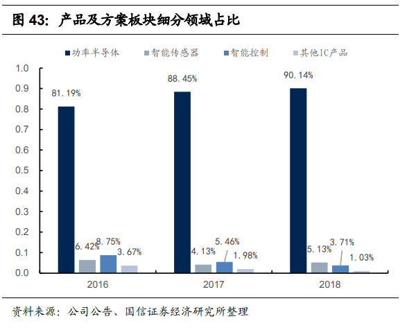 功率半导体占公司营收绝对主力,营收超8成,其他产品线还包括智能传感器、智能控制等。