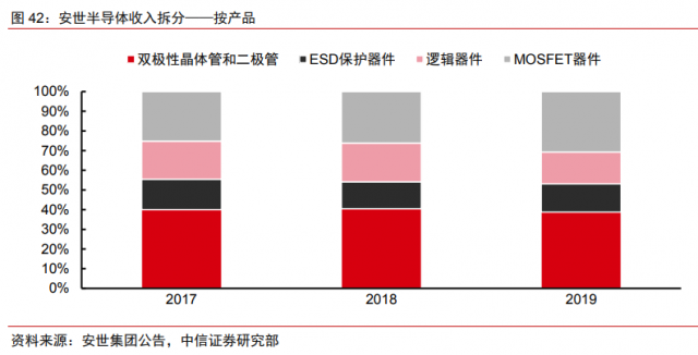 公司产品按类型可分为双极性晶体管和二极管、MOSFET器件和逻辑及ESD保护器件三大事业部,其中前两者均属于功率半导体中的分立器件,2019年两大事业部营收占比超 65+%