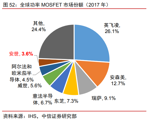 英飞凌同样是MOSFET和IGBT细分市场的领先者,分别以27%和28%的市占率位居全球第一的位置。不同于二极管市场和晶体管市场的高度分散化,IGBT和MOSFET市场由于其技术门槛更高,具备更高的市场集中度。
