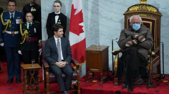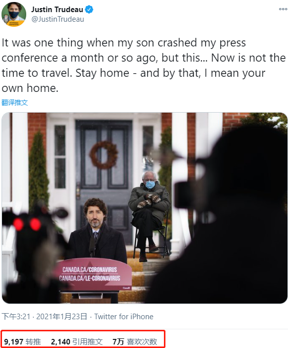 1月23日,杜鲁多在个人推特上发了一张每日简报的照片,后面的台阶上也P上了红遍全网的Sanders照片,并用作“反面教材”调侃道,“我儿子一个月前不请自来出现在我的记者会上也就算了,但是(如果Sanders出现在这就不太好了)...现在可不是旅行的时候。请大家待在家中!你自己的家中!”