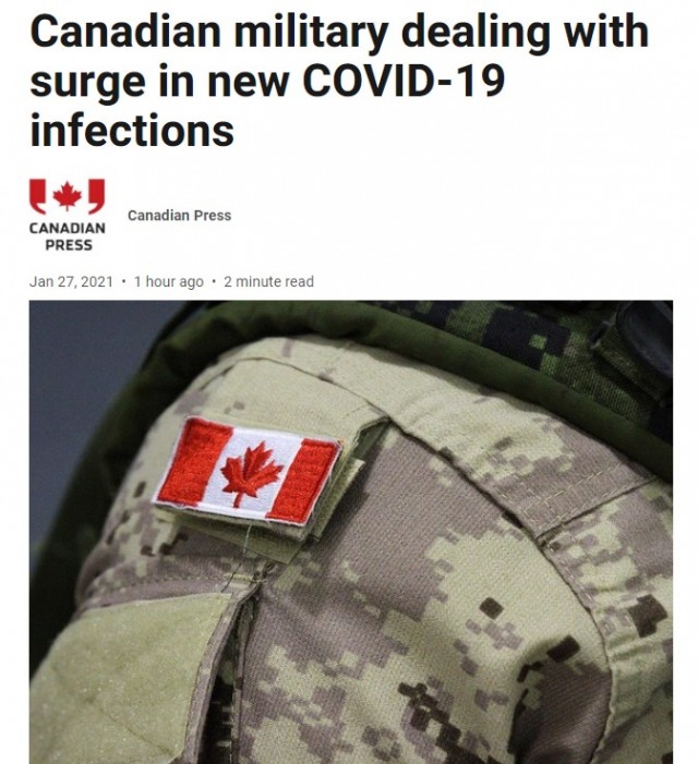 根据加拿大国防部的数据,自2020年12月底至今已有近250名军人感染新冠病毒,进入疫情爆发阶段,自2020年3月疫情爆发的前9个月感染人数少于700人。除在国内的加拿大军人感染人数出现急增外,在国外的加国军人也受到疫情影响。自2020年3月疫情爆发至今,参与4个任务的军人有确诊感染记录,至今有超过1,000名在医疗单位工作或健康状况欠佳的军人已接种疫苗。