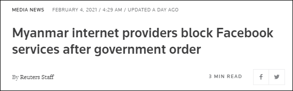 另外根据非政府网络监控服务公司Netblocks的数据显示,拥有2300万名用户的国有电信运营商——缅甸邮政和电信(MPT),在4日早些时候已封锁脸书及其旗下的Messenger、Instagram和Whatsapp服务。