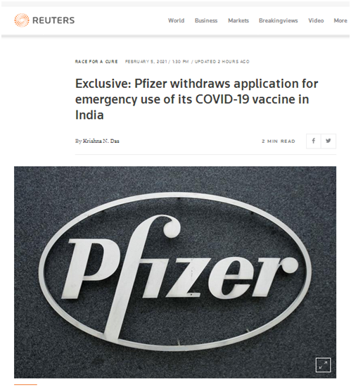 路透社曾报道说,在没有对其疫苗安全性和免疫原性进行小规模本地试验的情况下,中央药品标准控制组织(CDSCO)拒绝接受辉瑞公司的授权申请。辉瑞公司也曾告诉路透社,其应用得到了一项全球研究数据的支持,该研究显示,其新冠疫苗总有效率为95%,且没有出现与疫苗相关的严重安全问题。