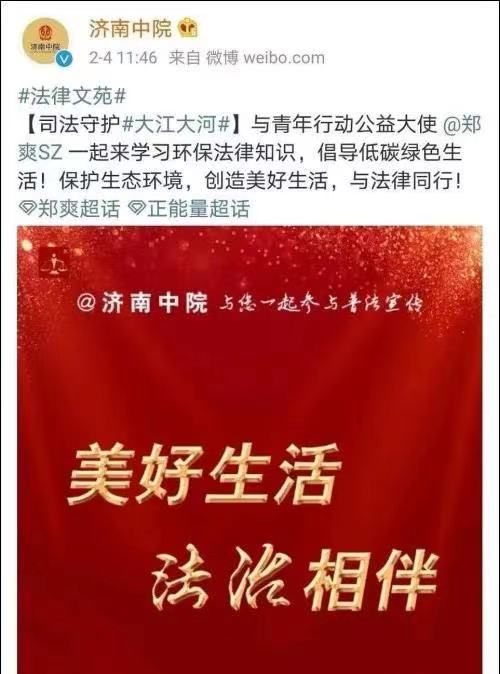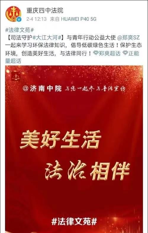 网友保留的截图显示,重庆四中法院和济南中院两家法院的官微所发布的文案基本一致,皆称呼郑爽为青年行动公益大使,号召网友“一起来学习环保法律知识,倡导低碳绿色生活!保护生态环境,创造美好生活,与法律同行”。