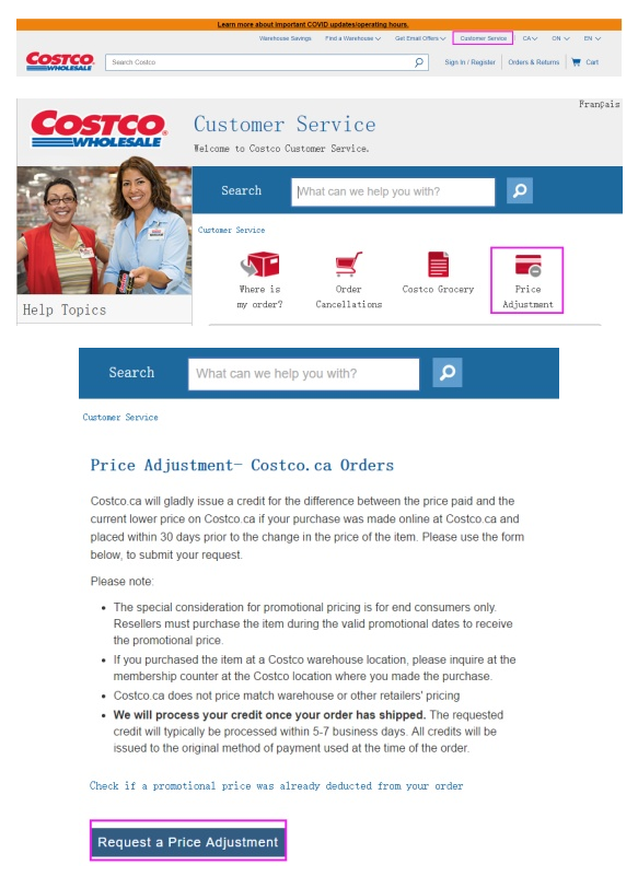 Costco官网costco.ca购买的商品如遇价格变动也可以在线提交退差价申请。