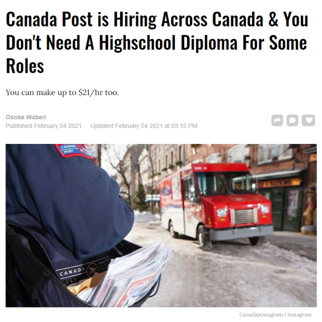 Ref:https://www.narcity.com/en-ca/money/canada-post-is-hiring-across-canada-you-dont-need-a-highschool-diploma-for-some-roles