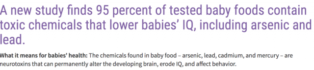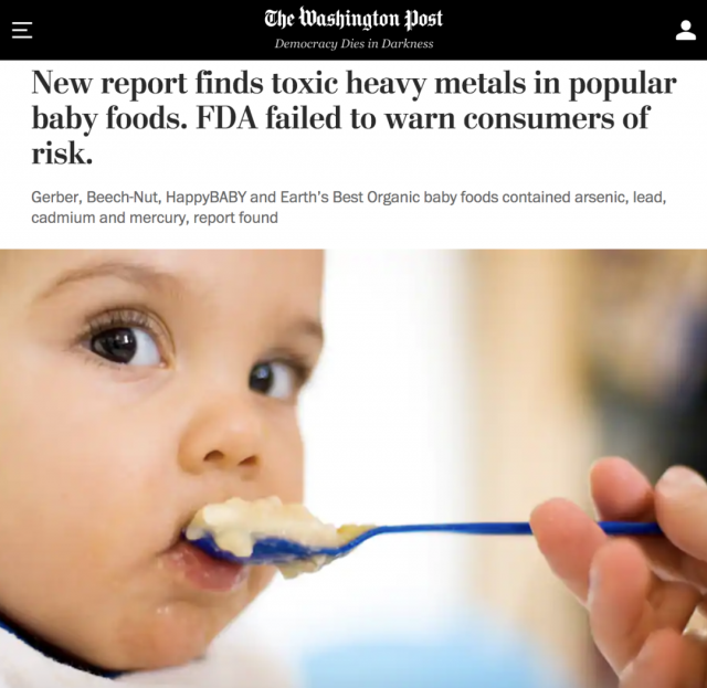根据美国国会2月3日发布的报告,部分品牌婴儿食品中存在水平极高的砷、汞、铅、镉等危险重金属元素。这是被各公司“内部允许”的,而且出售的婴儿食品所含重金属“经常超出安全水平”!