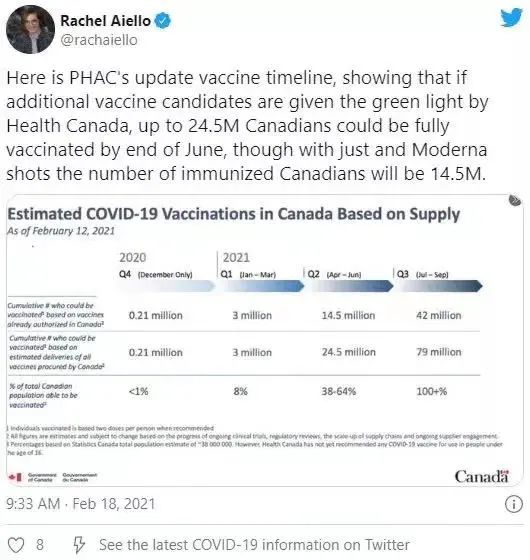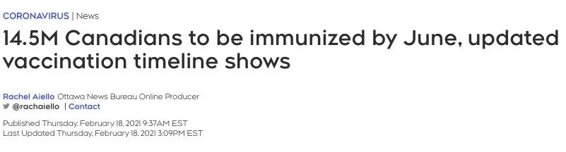 根据最新的疫苗接种时间表,到今年6月底,至少有1,450万加拿大人可以完成接种,占全部人口的38%,该数据是根据每人注射两剂的情况算的。